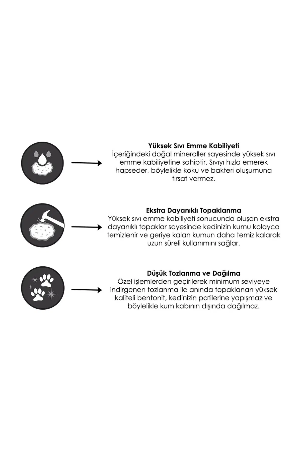 Düşük Tozlanma ve Dağılma Özel işlemlerden geçirilerek minimum seviyeye indirgenen tozlanma ile anında topaklanan yüksek kaliteli bentonit, kedinizin patilerine yapışmaz ve böylelikle kum kabının dışına dağılmaz.