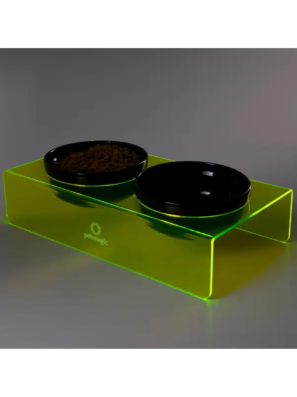Petmagic Akrilik Pleksi Evcil Hayvan Siyah Seramik Kaseli İkili Kedi ve Köpek Mama Su Kabı-Neon Sarı